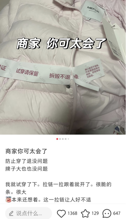 原因显而易见,社交媒体上不乏商家对无良羊毛党的控诉:其利用平台“七天无理由退货”规则,把衣服穿出去拍完照再退回,往往影响产品二次销售。