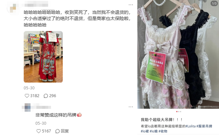 巨型吊牌夺人眼球,固然能够在一定程度上减少蹭穿拍照的行为,然而更多的情况,或许是正常购买的消费者收货后看到吊牌啼笑皆非,在网上晒出来带来一波流量——
